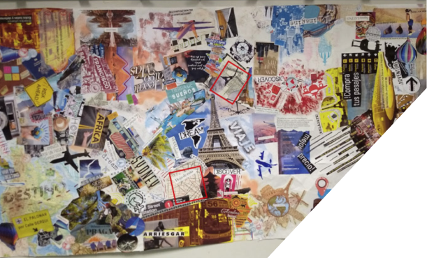 Diseño de una sobrecubierta de un libro a partir de 2 encuadres de un collage sobre la temática “Viaje”.