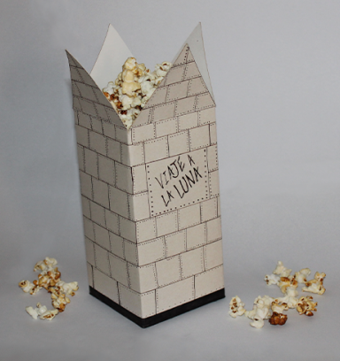 El contenedor de alimentos es una clásica pochoclera que simula la forma de un cohete, con una frase para dar inicio a la experiencia.